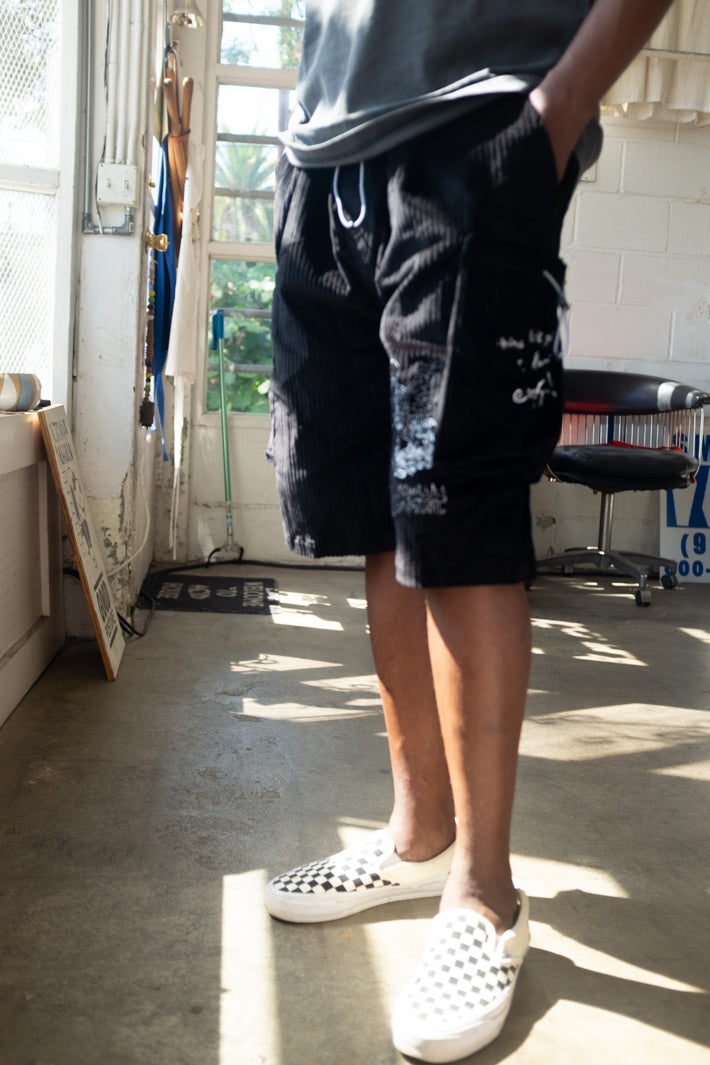 Experience comfort and style with the Euphoria Short in Black. Crafted from premium 100% cotton fine wale corduroy, these baggy shorts feature playful embroidered graphics and practical cargo pockets. The drawcord enclosure ensures a perfect fit, making them your go-to for casual adventures with a fun twist.