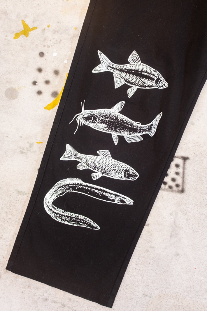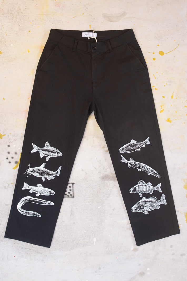 The Cape Cod Trouser in Black offers a clean, straight-leg fit tailored for a refined workwear aesthetic. Featuring a subtle screen-printed fish motif, this piece reflects coastal inspiration from Cape Cod. Designed by Theo Martins of Good Posture, it combines thoughtful craftsmanship with timeless functionality, making it a versatile addition to any wardrobe.