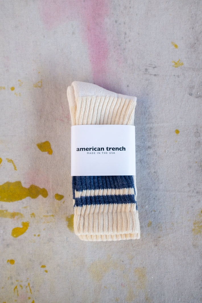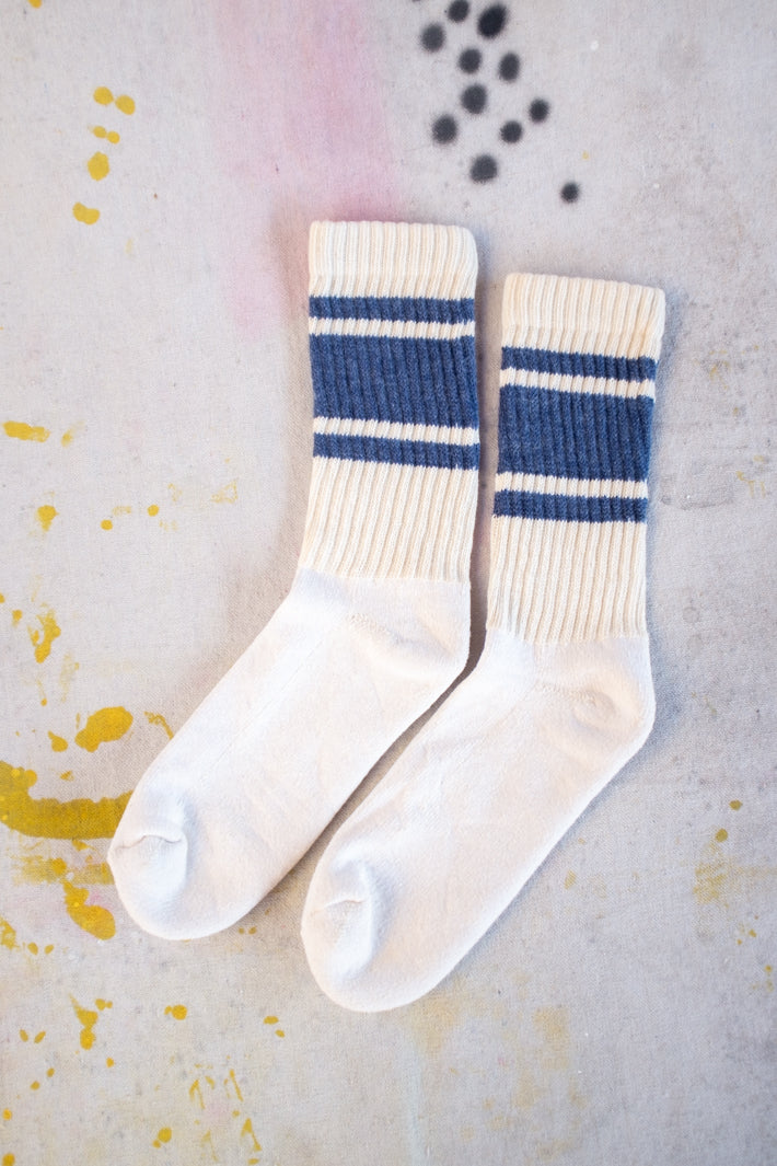Introducing our Mono Stripe Sock in a denim blue color! Made with natural, unbleached cotton, these medium weight socks offer a comfortable and cushioned footbed. The colorful retro design is sure to make a statement and become a staple in your sock collection. Perfect for all-day wear, get ready to be impressed!