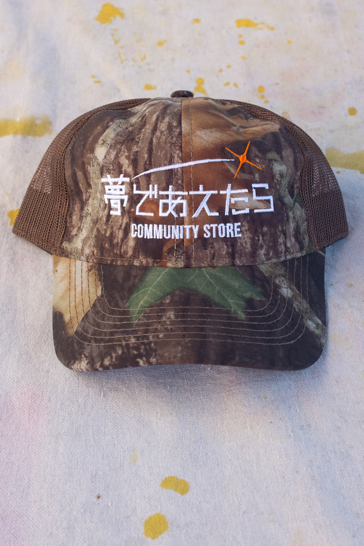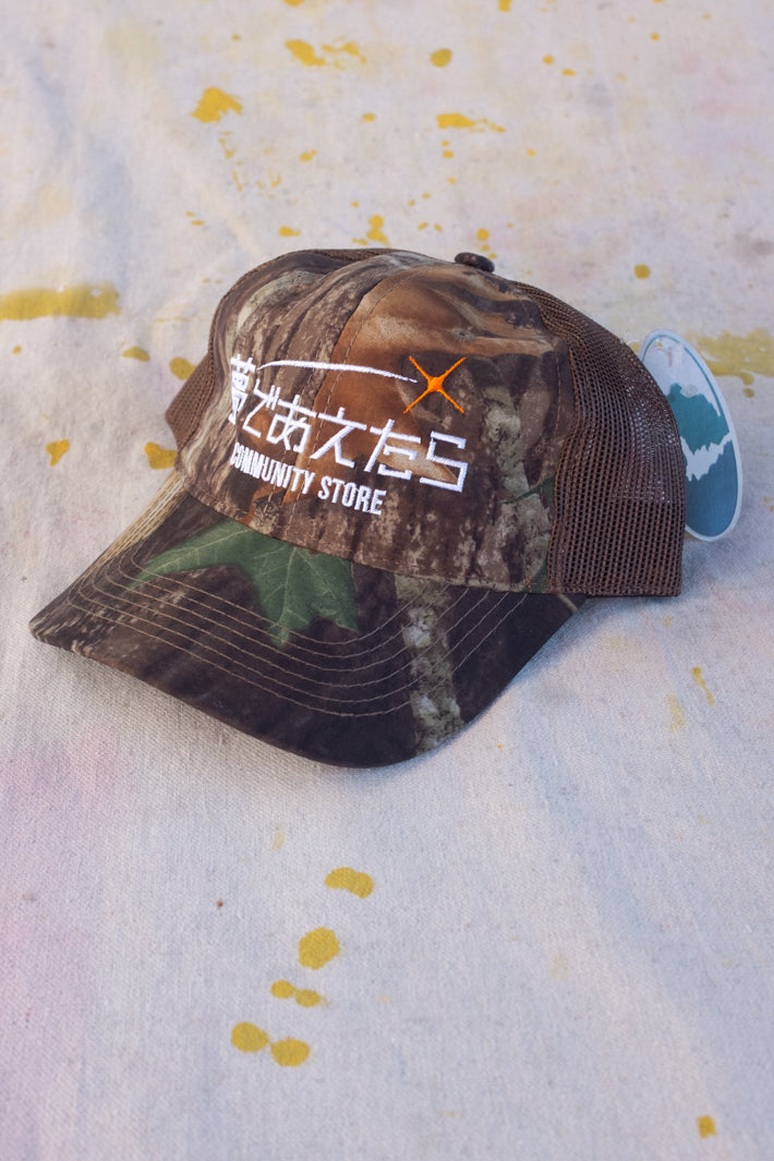 This snapback trucker cap features a genuine Real Tree camo pattern, combining rugged outdoor style with urban appeal. Expertly embroidered with the Community Store logo, it celebrates Kawasaki's local gathering spot for food and drink enthusiasts. Designed in collaboration with Mr. Pigu of Tenbox Clothing, this cap offers both breathability and a comfortable fit, making it ideal for everyday wear or showcasing community pride.
