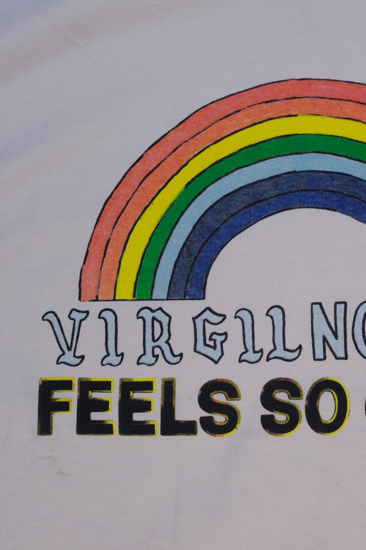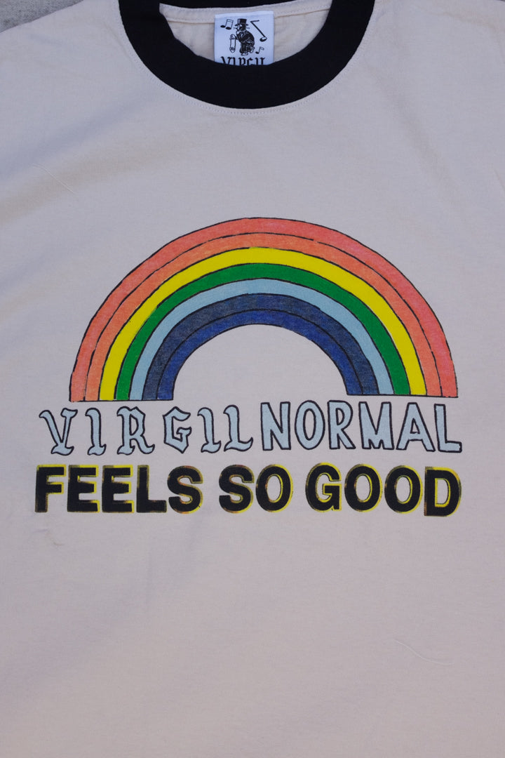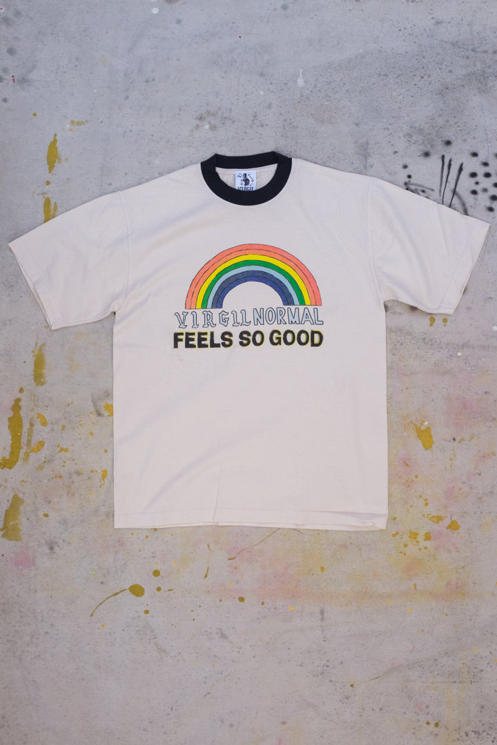 Elevate your everyday style with this Los Angeles-made tee that merges art and fashion. Featuring a hand-drawn rainbow and logo crafted with Posca markers, complemented by dimensional 3D mailbox-style letters, this piece showcases crafty artistry. The primitive 4-color screen print process delivers stunning photo-realistic detail that captures light and shadow beautifully. Constructed from premium 6.5 oz cotton jersey, it offers comfort and durability that lasts. The classic cream and black ringer design provides 92' styling for any wardrobe. Own a wearable work of art made right here in Los Angeles.